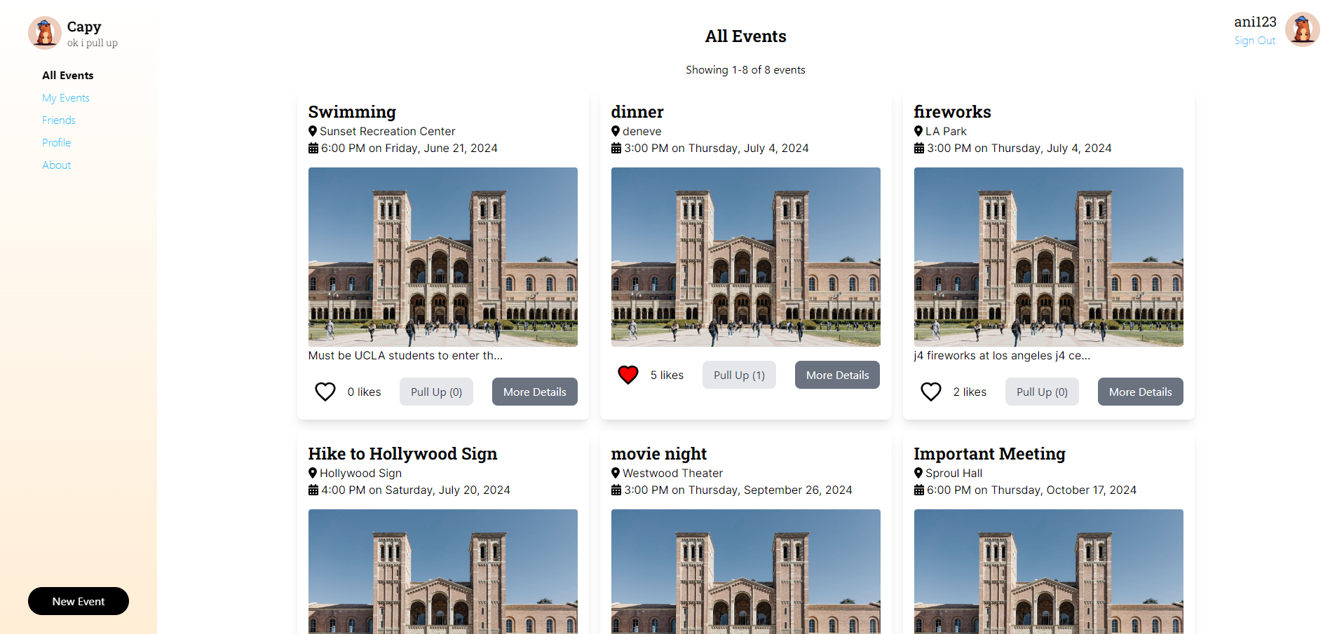 Capy is a social media application where users post events that they are hosting so that others at UCLA can “pull up” to them!