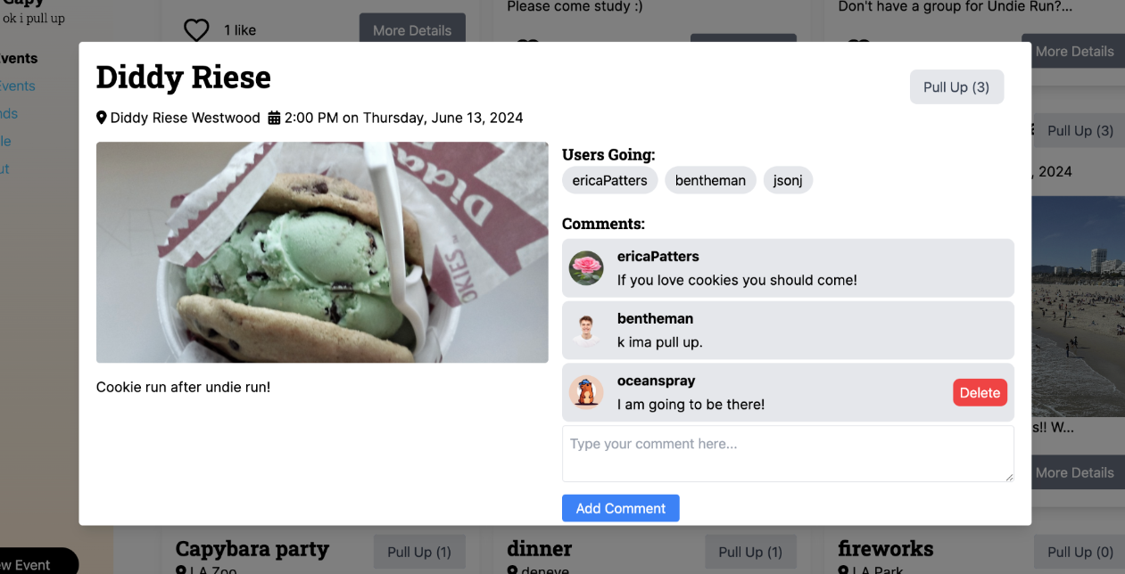 This is a modal view of each event where users can see comments as well as a list of users that are RSVPed, as well as comments on the event.